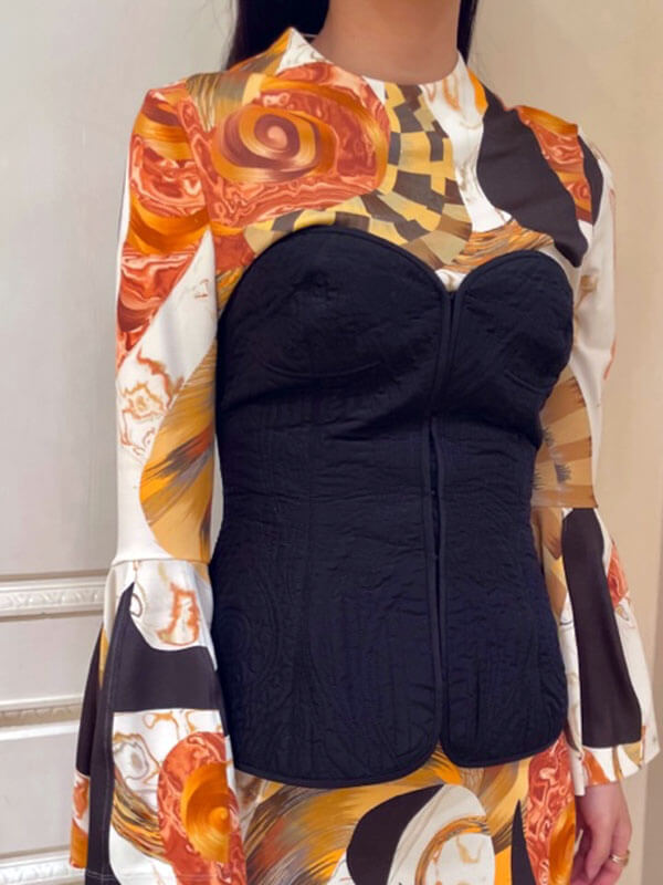 至極個人的な感想になるのですが、幼い頃からレースアップのディテールが異様に好きで(編み上げのロングブーツが憧れでした)、このビスチェを見た時にかつて憧れていた気持ちがぶわっと蘇りました。マメのお洋服には新しさもありますが、懐かしさやノスタルジーも含まれているのが魅力の一つではないかと思っています。