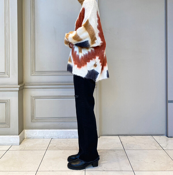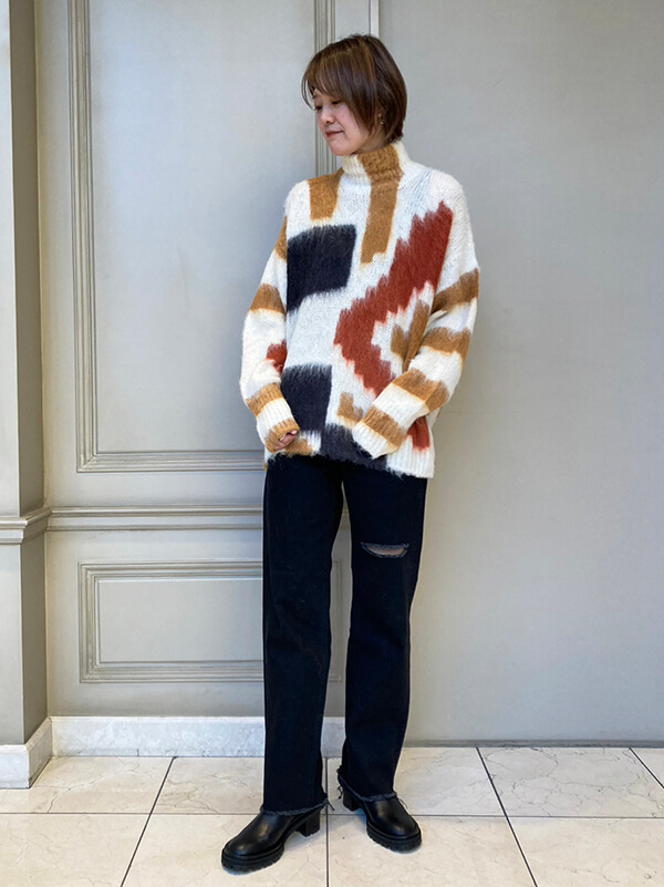 色はこの秋注目のブラック。膝より高めの位置に施されたダメージがアクセントになっています。