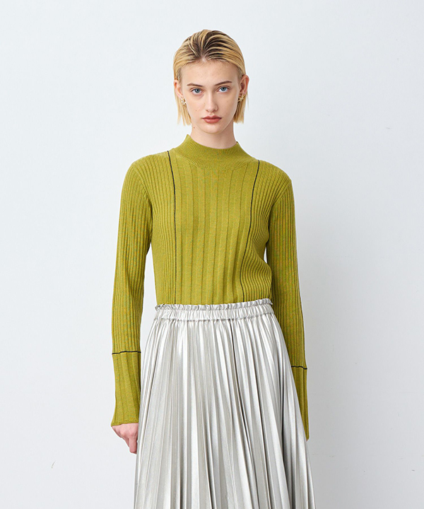身頃と袖で異なるリブをミックスしたボトルネックニット。さりげなくあしらった配色ラインがアクセントに。袖と脇が細めのリブになることによって、視覚的に細見え効果もあります。トップスをこれ1枚で着用いただくのはもちろん、レイヤードにも活躍してくれるアイテムです。