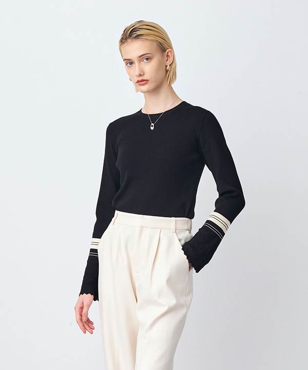 袖口に透かし編みデザインをあしらったニットプルオーバー。