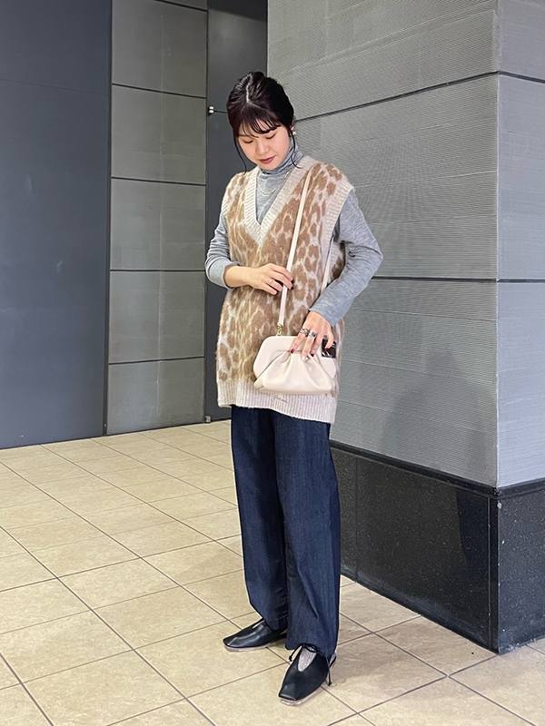 こちらのコーディネートのポイントは、レオパード柄のVベストとデニムを合わせたカジュアルスタイルです!コロンと特徴的なアイボリー色のバックが可愛らしさを引立たせてくれています。