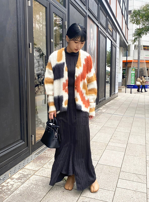 足袋ブーツは柄のアイテムやデザイン性の高いアイテムとの相性◎!カーディガンの色味を拾い、ブーツはキャメルにすることでモードに決めすぎないのが今の気分です。