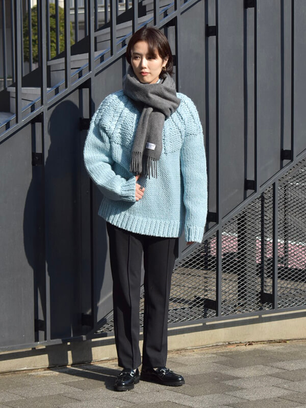 太番手でざっくりと編まれたニットと、しっとりと艶の綺麗なカシミアストールは相性抜群ですよね♪