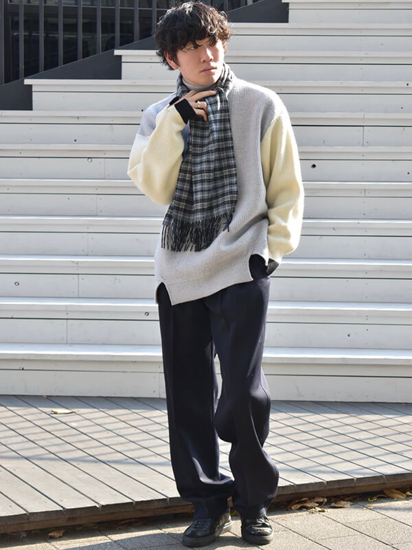 ストールとバックをグレーでまとめる事で、小物に統一感が出ますね。