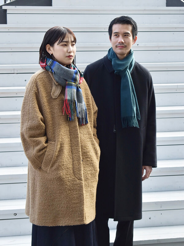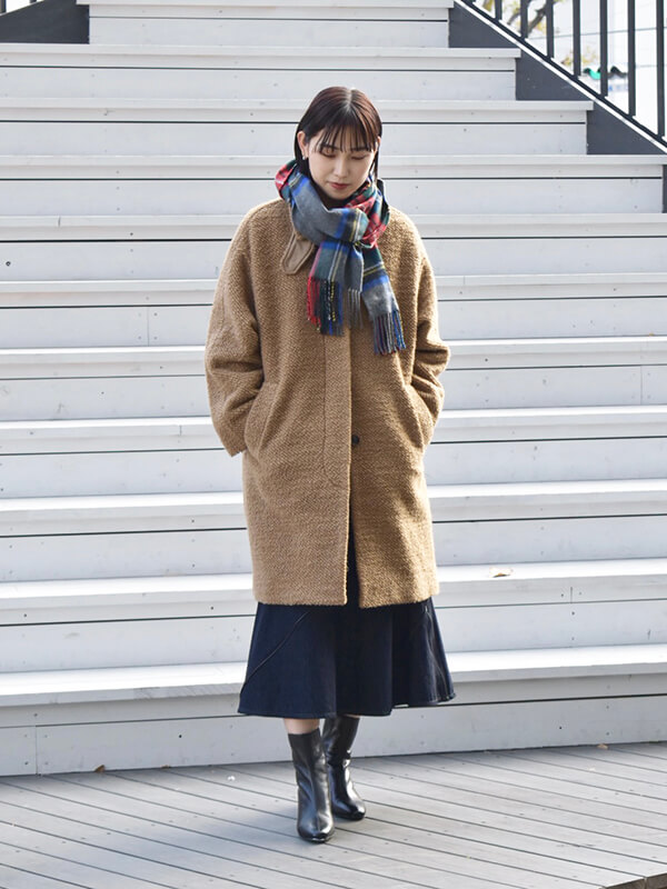 カーリーな毛足のキャメルのコートは、ゆったりとしたサイズ感で一見重たく見えますが、ストールが入ることで重心が高くなり軽やかに見えます!