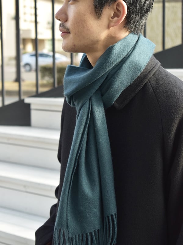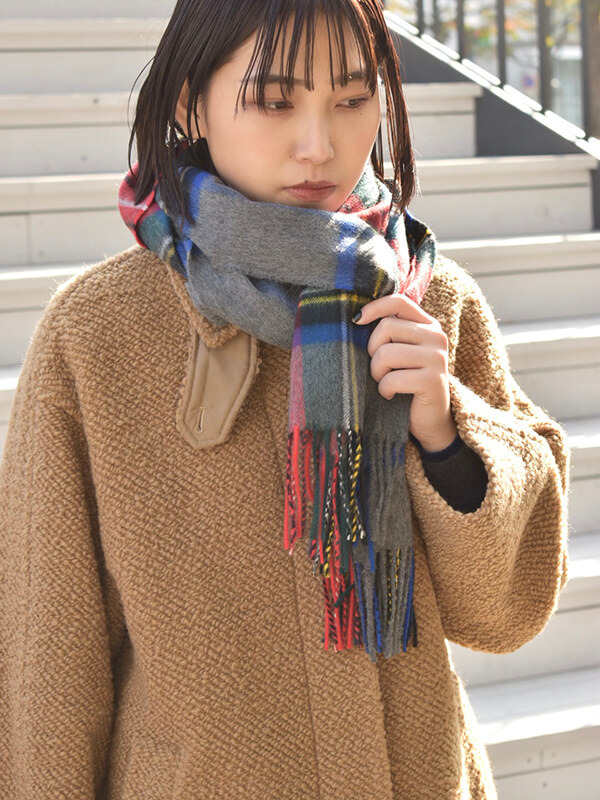カシミア素材のマフラーは、艶があり光を反射するのでレフ板効果でお顔が明るく見えるのが推しポイント!