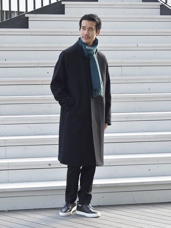 シックなブラックのコートに、差し色でキレイなブルーを…
