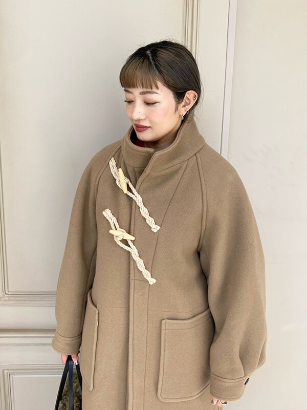 着用したダッフルコートは、斜めに配された木製のトグルとスタンドカラーのデザインが印象的な1着。