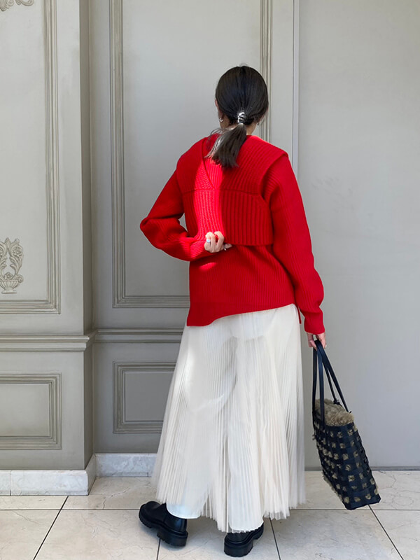 初詣らしく(笑)赤白のトップスとボトムで合わせて、華やかにまとめて。