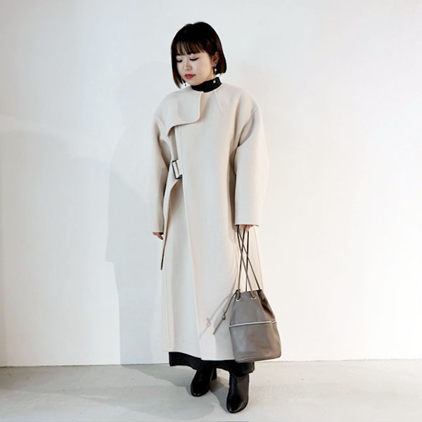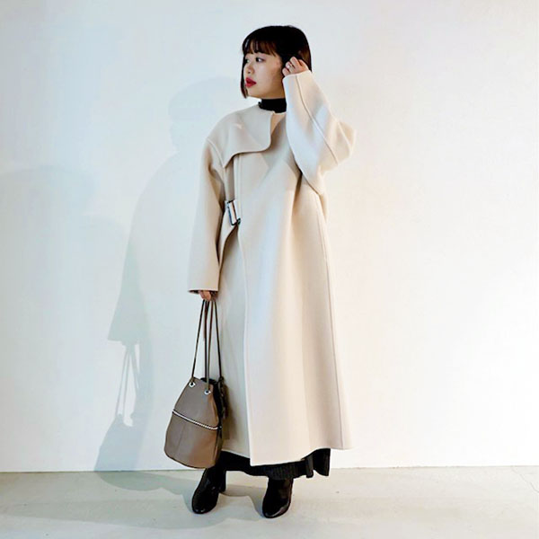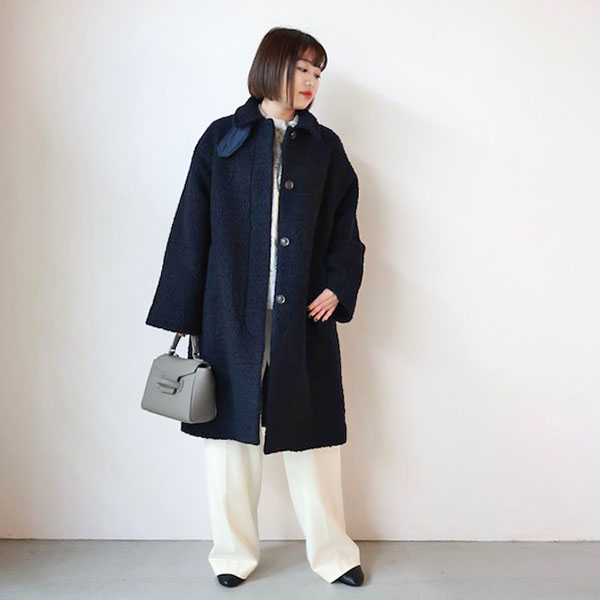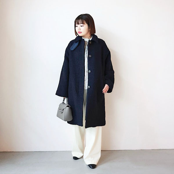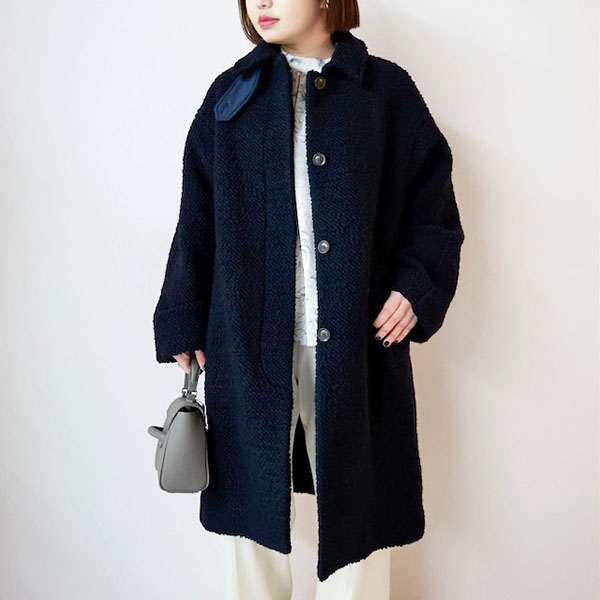 こちらのオーバーコートはくるくるとしたロービング素材が目を引く素材感で、ふんわり柔らかな雰囲気に。“ラクしてキレイ”をかなえてくれる主役級コートです。