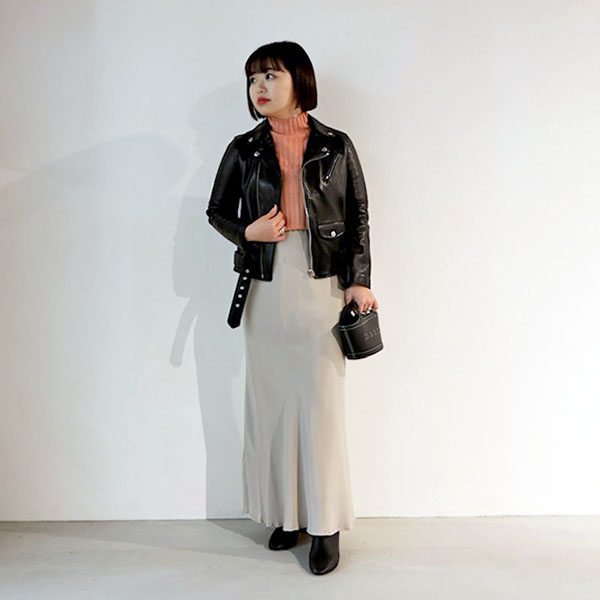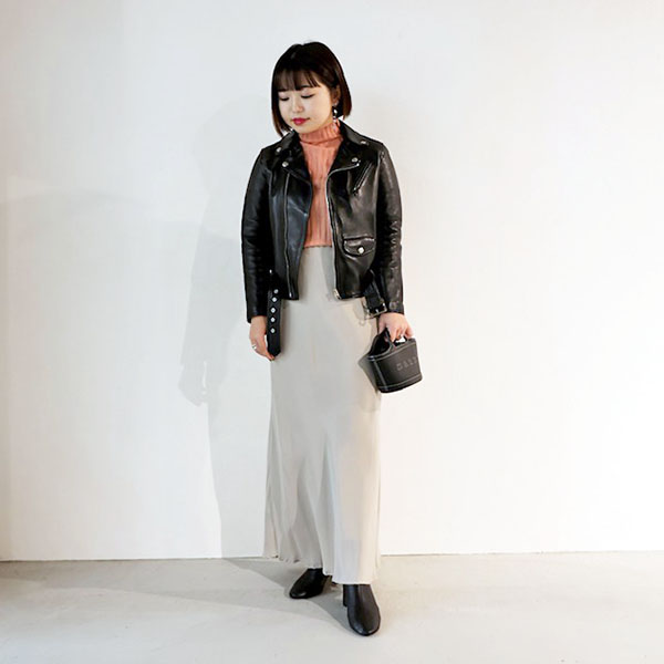 強めなレザージャケットもピンク・ベージュと組み合わせて柔らかい印象に。
