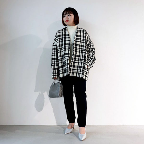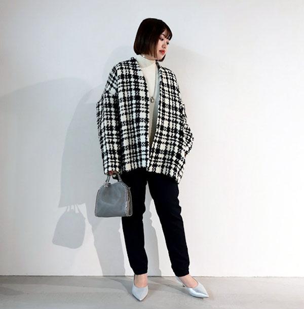 今年流行のノーカラーツィードジャケット×スッキリ見えするテーパードパンツでエレガントに。スッキリとした編み地のジャケットはカーディガンとジャケットの中間的な存在です。室内で羽織っていても邪魔にならないのは寒がり女子には嬉しいですね!