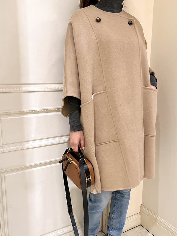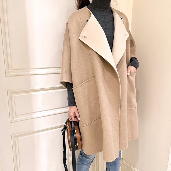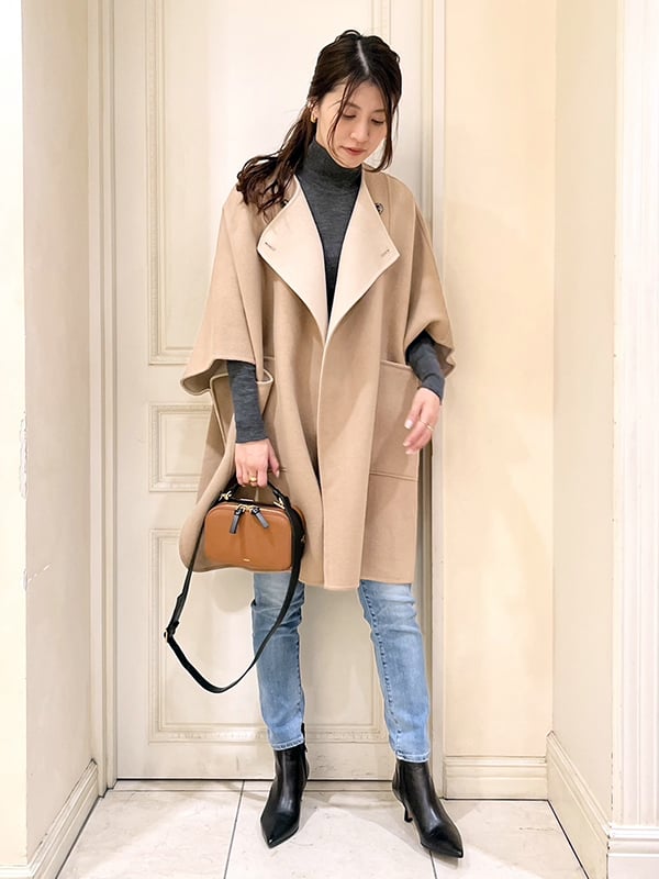 リバー仕立てのポンチョコートがポイントです。手首が出るのでインナーのニットとのレイヤードを楽しめます。気合を入れている印象ではないのに計算されてるオシャレ感が演出できます☆笑