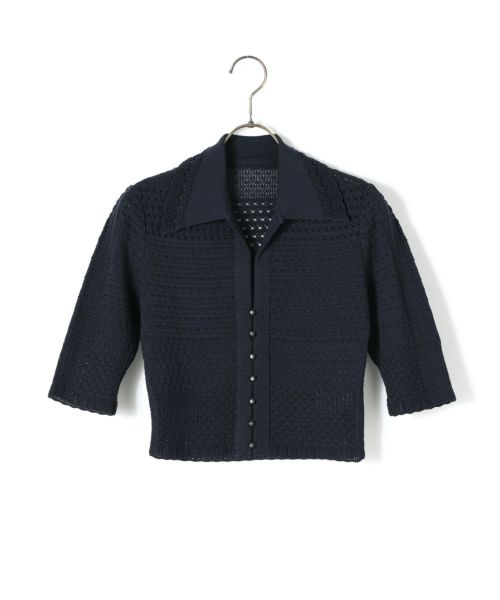 Mame Kurogouchi(マメ クロゴウチ)のニットトップス。多様な織を組み合わせたストライプの透かし編みの美しい生地は、身体にそっと優しく添いながらも緩やかな立体感を生み出してくれます。コンパクトなシルエットなので、ハイウエストのボトムスと相性がよく、開いた胸元は鎖骨周りを華奢にみせてくれます。長めの袖口は二の腕を優しくカバーしてくれ、スタイル良く見せてくれるアイテムです。