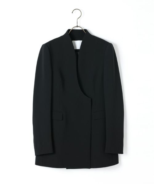 Mame Kurogouchi(マメ クロゴウチ)のノーカラージャケット。ネックラインに沿う様な緩やかなカーブパターンが印象的。ミニマルさと美しく繊細なカッティングにより、エレガントさと知的さを演出するアイコニックなスーツスタイルに。