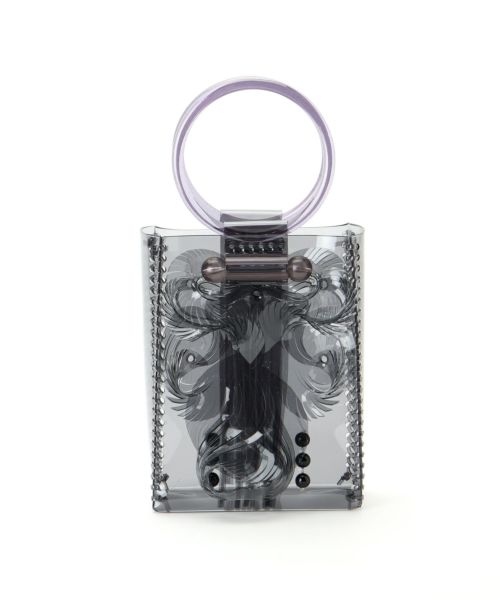 ポリ塩化ビニールを使用したMame Kurogouchi(マメ クロゴウチ)のアイコニックなハンドルバッグ。工業用素材として多く用いられる素材の美しさに幼少期の記憶にある冬景色を重ねたデザイナーが、自らカッターで切り、編み込み、原型を作ったのが始まりです。ガラスの様な繊細さをもち、立体モチーフが氷柱や氷をも連想させます。現在では裁断、パーツ加工、成型と組み立てが全て違う工場で行われ、職人の手作業によって組み立てられています。大きなリングのような持ち手が、装飾的なバッグ本体と印象的なバランスを生み出すデザイン。持ち歩く彫刻として、日々のコーディネートに華やかさを添えてくれる名品です。