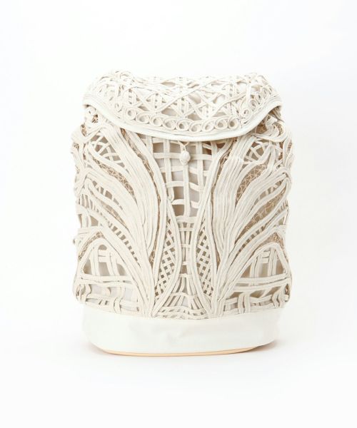 コード刺繍のテクニックを用いたMame Kurogouchi(マメ クロゴウチ)オリジナルの定番リュック。オリジナルのリネンコードを一筆書きの要領で柄を組みながら刺繍していくことで、伝統的な籠や植物からインスパイアされた編み模様を見事に表現。ショルダーストラップ部分にまで施された刺繍が正面からも程よいアクセントに。持ち手や底のレザーが高級感を演出するバックパックです。
