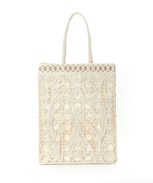 コード刺繍のテクニックを用いたMame Kurogouchi(マメ クロゴウチ)オリジナルのアイコニックなトートバッグ。オリジナルのリネンコードを一筆書きの要領で柄を組みながら刺繍していくことで、日本の伝統的な籠モチーフや植物からインスパイアされた複雑な編み模様を見事に表現。細かな編み込みが施されたハンドル部分も高級感を添えてくれます。