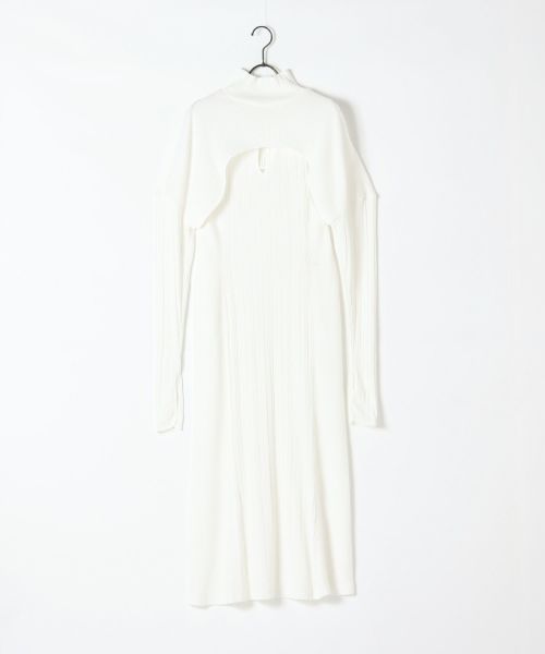 Mame Kurogouchi(マメ クロゴウチ)のジャージードレス。 柔らかな風合いに加え、立体感のある豊かな表情で綿の肌心地が良いドレスは、プルオーバーのクロップドトップとドレスを別々に着用することで2WAYの着こなしが楽しめます。ノースリーブドレスは1枚で着用することはもちろん、クロップドトップスとセットで着用することで、秋口まで長く着用することが可能です。袖口にはサムホールが付いており、手の甲までしっかりカバーする作りは、腕を細く長く見せながらコンパクトなシルエットに仕上がりました。