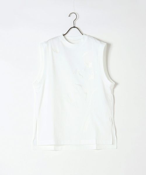 Mame Kurogouchi(マメ クロゴウチ)のノースリーブトップス。 アルルを旅した記憶から美しい草花の風景をフロントに刺繍で表現しています。ノースリーブのシンプルなトップスはアームホールを大きく設計することで、様々なレイヤードスタイルも楽しめる1着に。二の腕を華奢に見せる立体的なシルエットと、裾に前後差をつけることでヒップ周りをカバーし、スタイルアップを叶えるアイテムに仕上がりました。