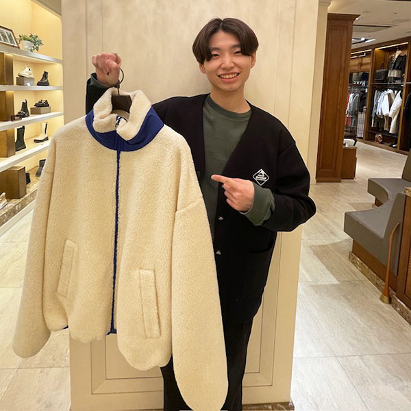 白いボアにブルーのアクセントがポイントになって映えるジャケットです。