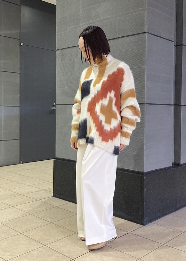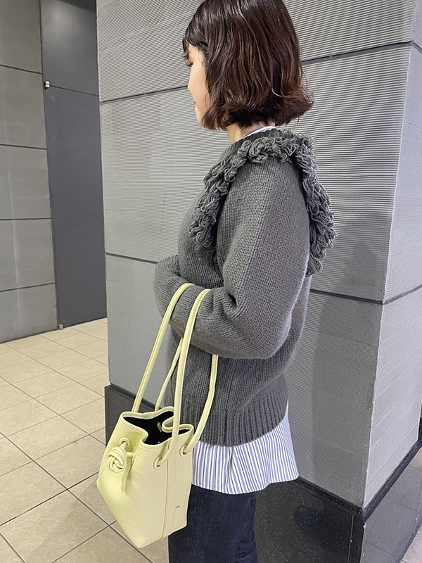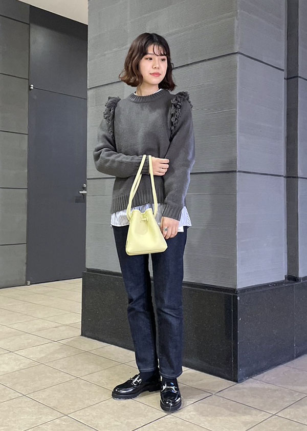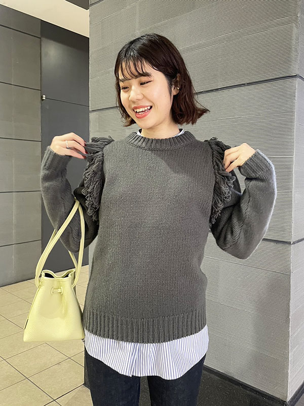 肩のフリンジがひと癖ありのニットです!デザインニットにチャレンジされたい方はこの機会に是非。