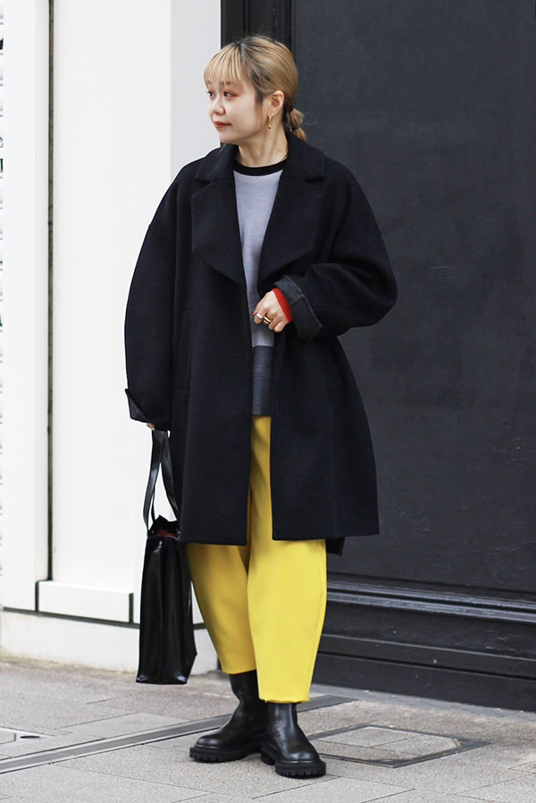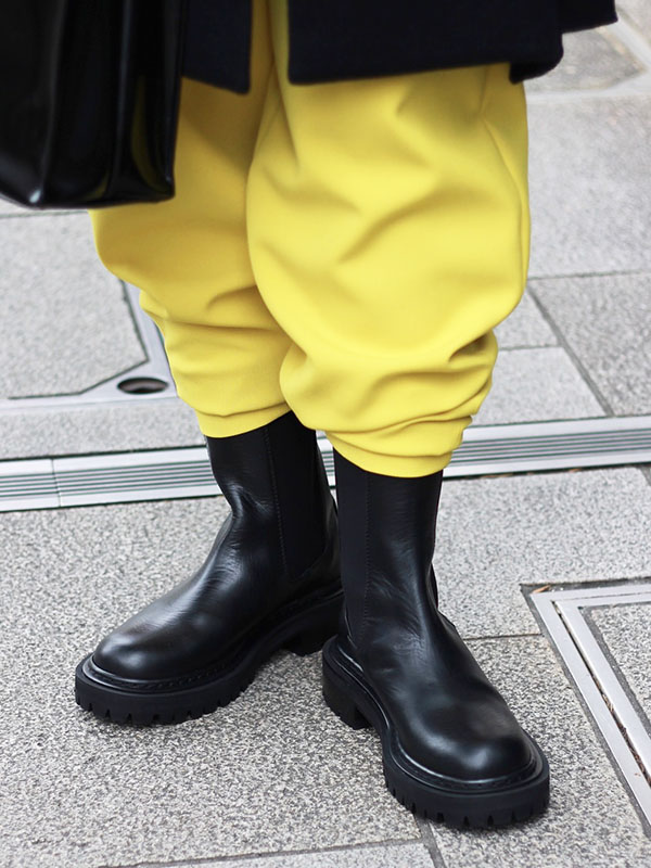 目を引くイエローに負けないこのソールのボリューム感!存在感のあるブーツだからこそ、派手色ボトムと合わせたくなりました^^