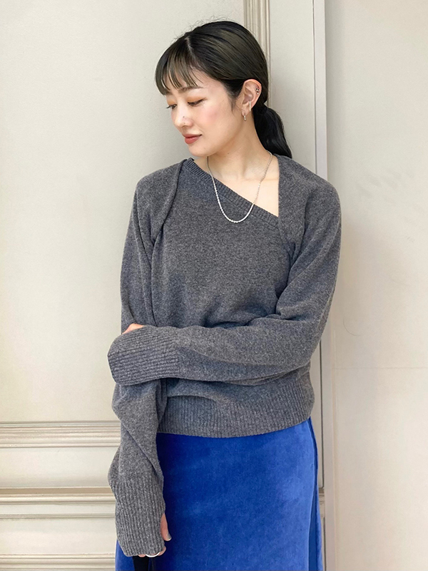 ワンショルダーベストとショート丈のボレロがセットになったアイテム。セットで着るのはもちろん、シャツやカットソーとのレイヤードも楽しめて春先まで様々な着こなしをしていただけます!