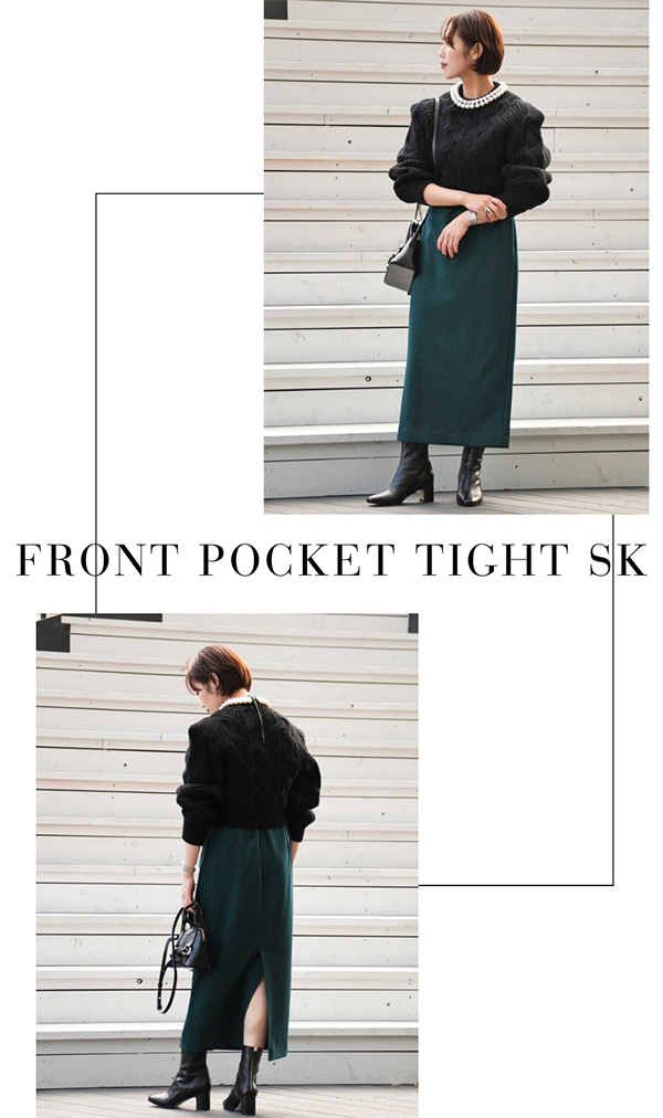 フロントポケットがさりげなくアクセントになったロングタイトスカート。