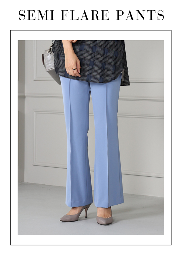 広がり過ぎない、さりげないフレアタイプなので履きやすく 足を長く綺麗に見せてくれます。後ろゴムで、ベルト不要のリラックスした履き心地も魅力。