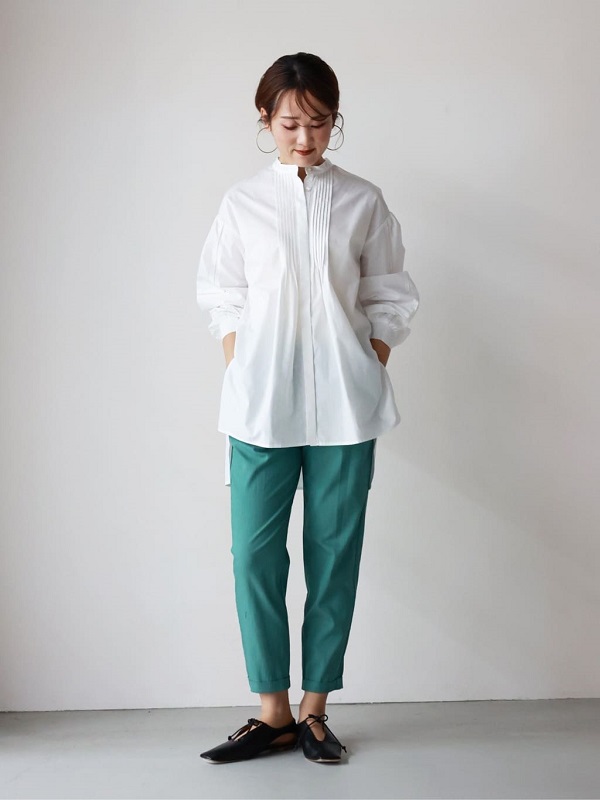 カラーパンツ × 白ブラウスは定番の組み合わせですよね。
