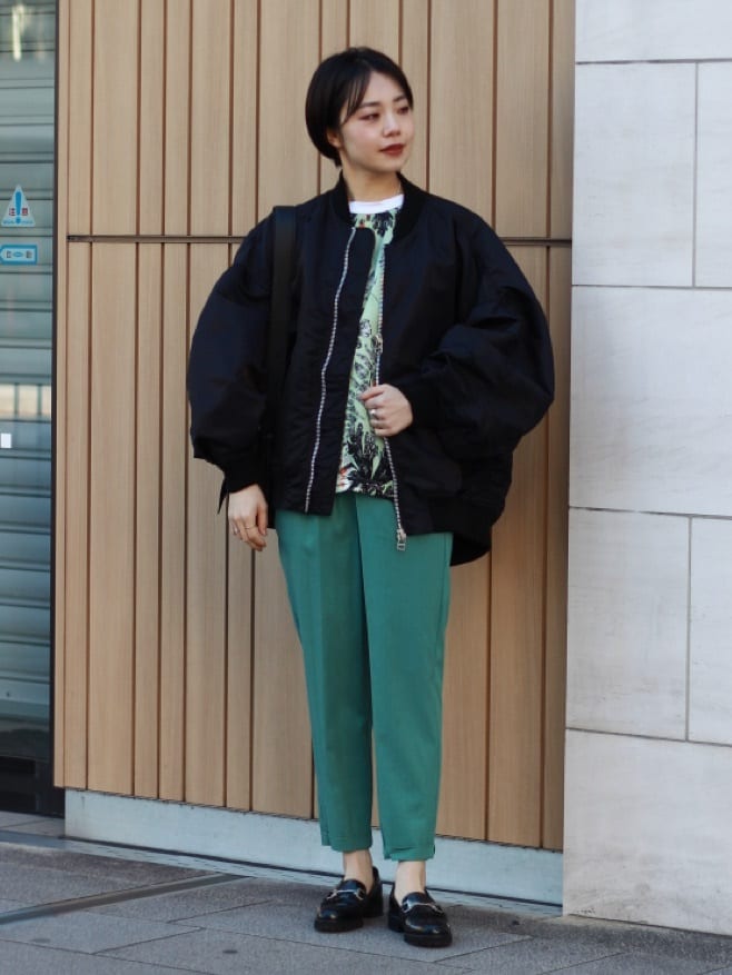 淡いお色味のGREENなので、黒の強さを和らげてくれて、どこかこなれた印象にしてくれますね♪