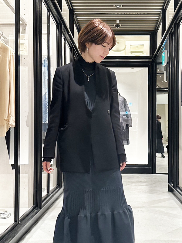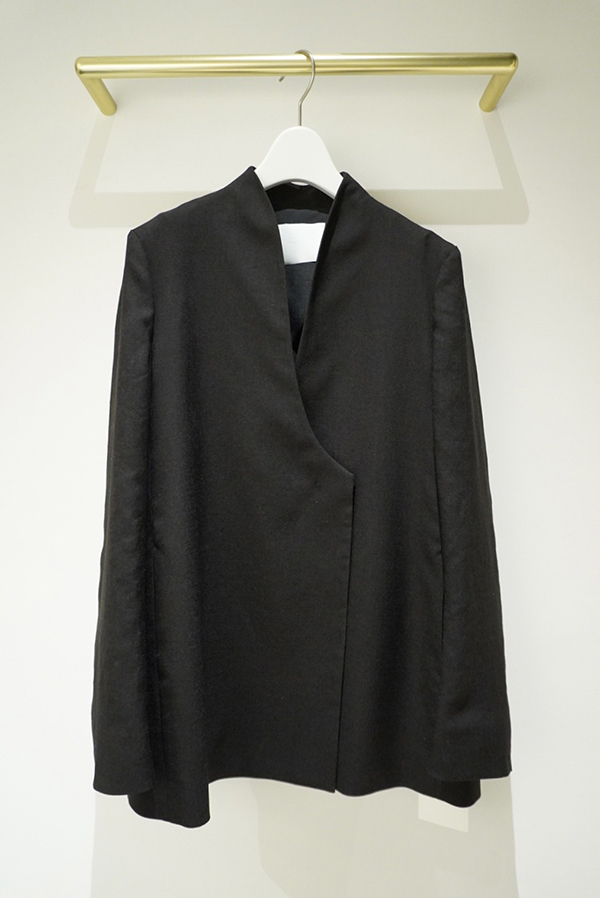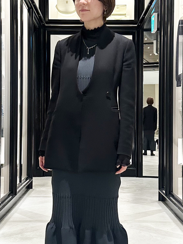 比翼仕立てのダブルブレストジャケットで、マメらしいカーブカッティングが首回りやウエストラインを綺麗に見せてくれる1枚です。