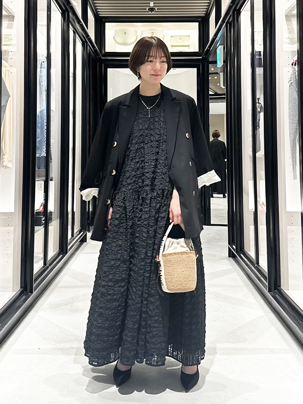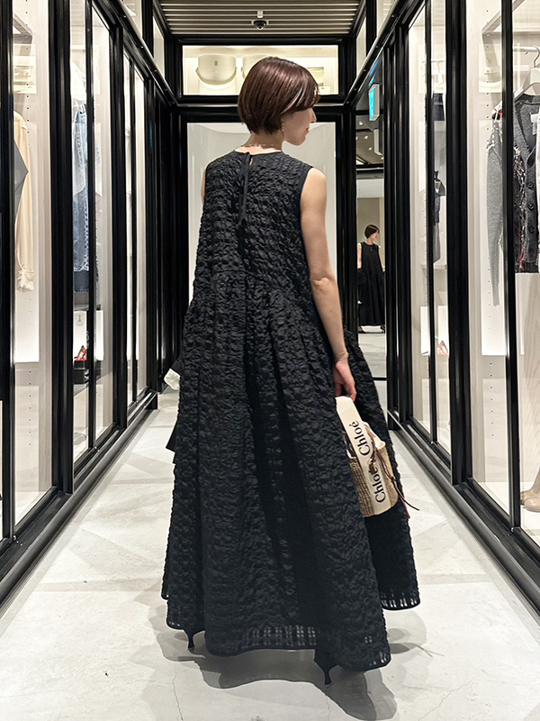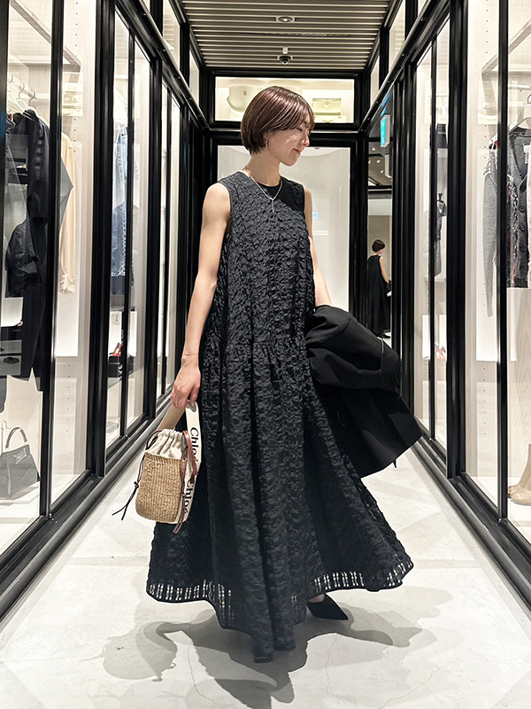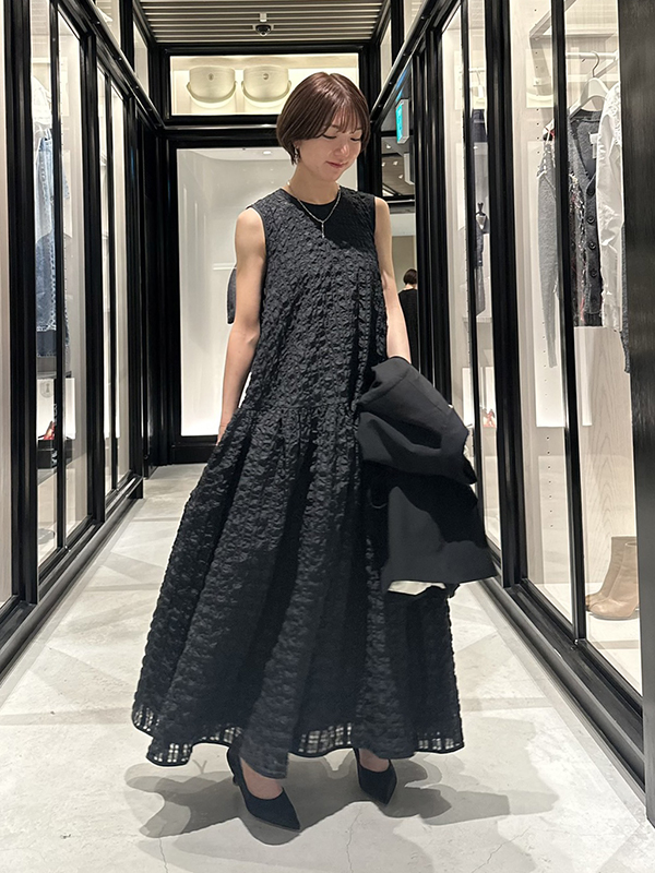 愛用品のマメの美術館ジャケットの中に着ているのは麻布台店でも大人気ブランド『CFCL』のノースリーブワンピース。