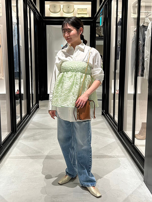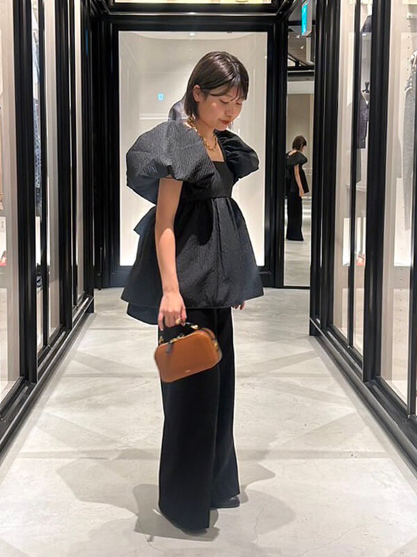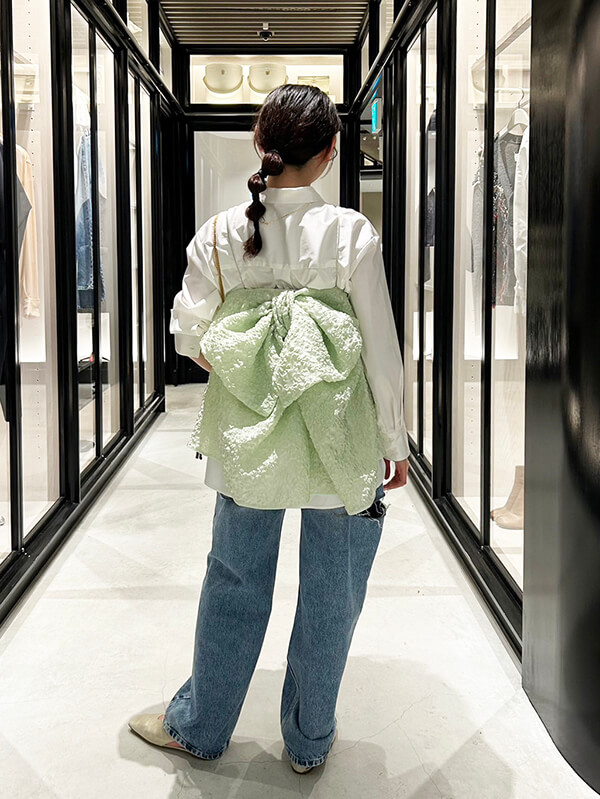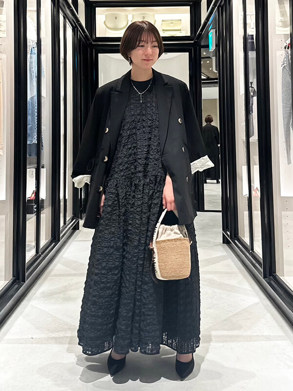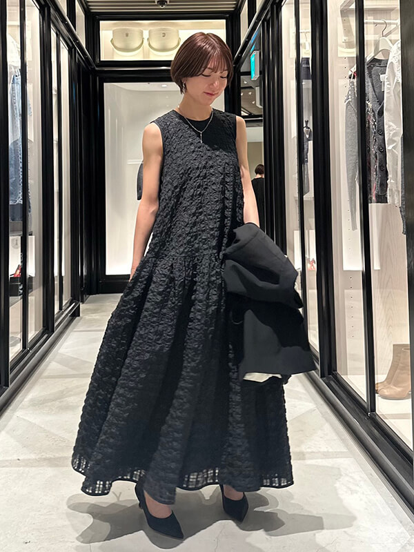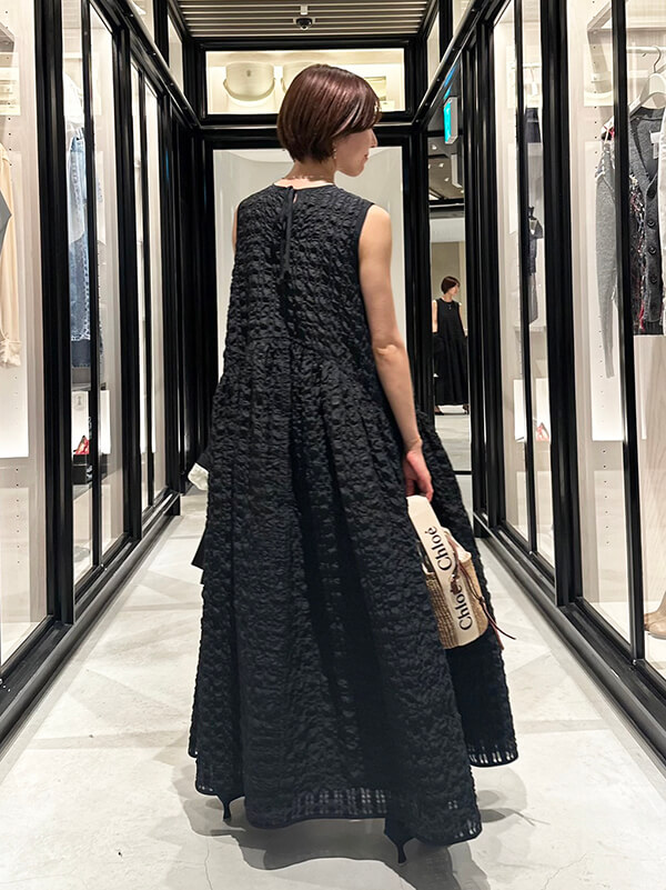 オーバーサイズのドレスやブラウスに、繊細なディテールが加わることで、全体的に程よくリズムが付き、洗練された印象に。