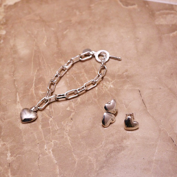 キャッチーなハートデザインが可愛いブレスレットとピアス。ぷっくりとしたボリュームのあるハートモチーフが乙女心をくすぐります♡