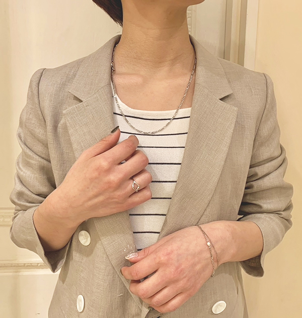 ブレスレットは大きめのチェーンなので甘くなりすぎず、カジュアルなスタイルにも合わせて頂けますよ。