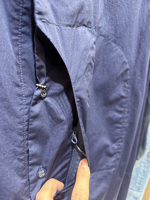 前立てから大きなタックを取っているため、脇にスリットが無くても容易にプルオーバー着脱が可能です。