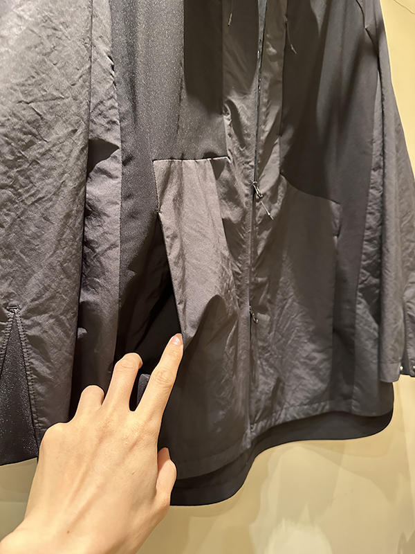 重なりのある比翼を切り抜いたような前立てに大容量のファスナーポケットを装備しています。