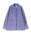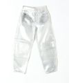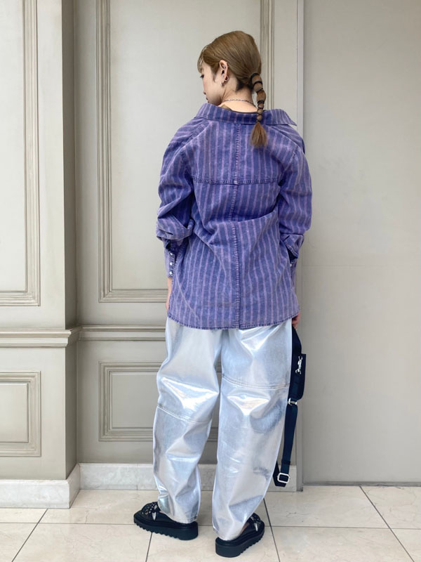 デニム地のストライプシャツにデニムにシルバー箔押しのパンツを合わせた上級者デニムONデニムコーデ