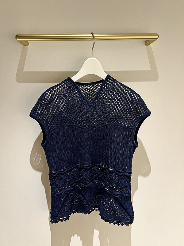 透かし柄の中に陶器に描かれた菱形や花柄模様を全体にあしらったニットトップ✨ このメッシュジャガードのデザインに一目惚れしてしまいました!肩がキャップスリーブになっているので、華奢見せも叶います✨