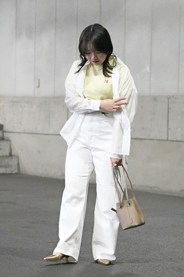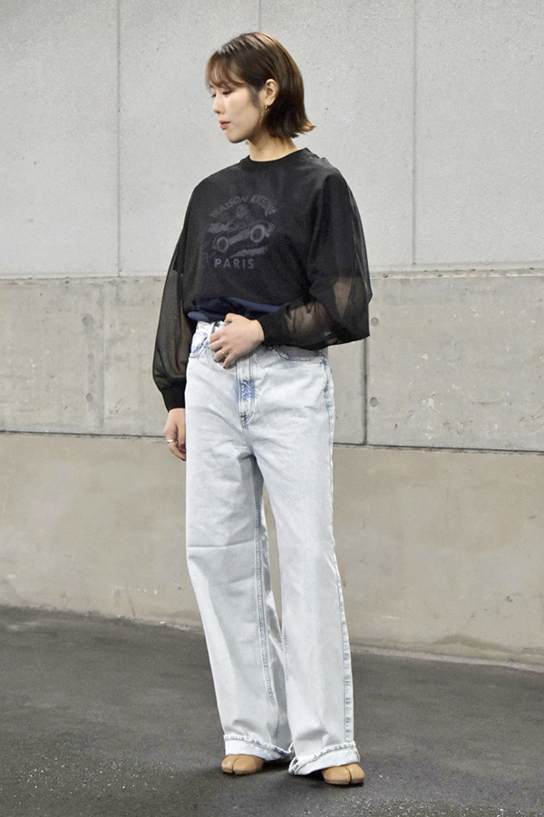 今期トレンドのシアー×ワイドデニムをしっかり抑えたコーディネートとなっております。流石ですね!