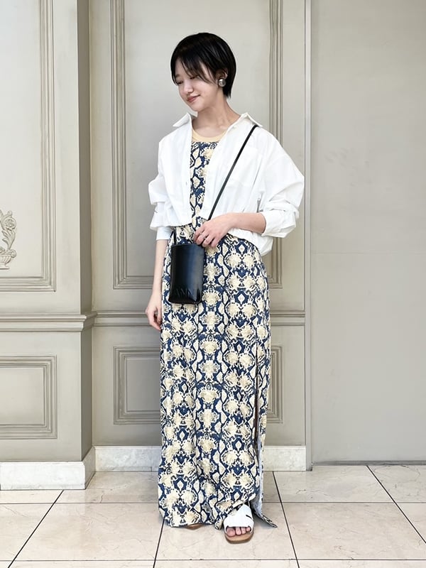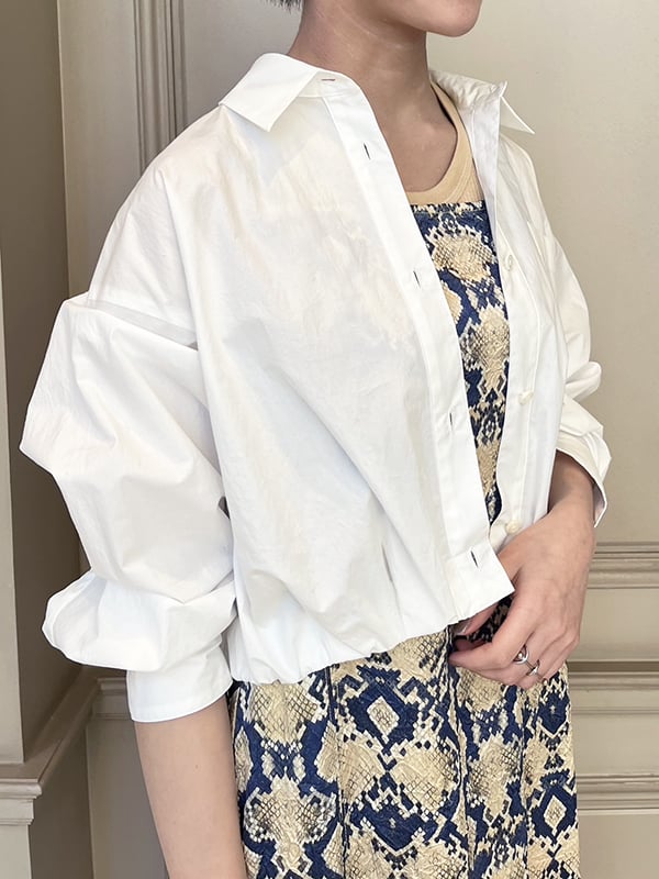 コーディネートのようにボタンを開けてワンピースの羽織としても、閉じてシャツカラーをしっかり見せて着る着方も楽しめる万能シャツです。