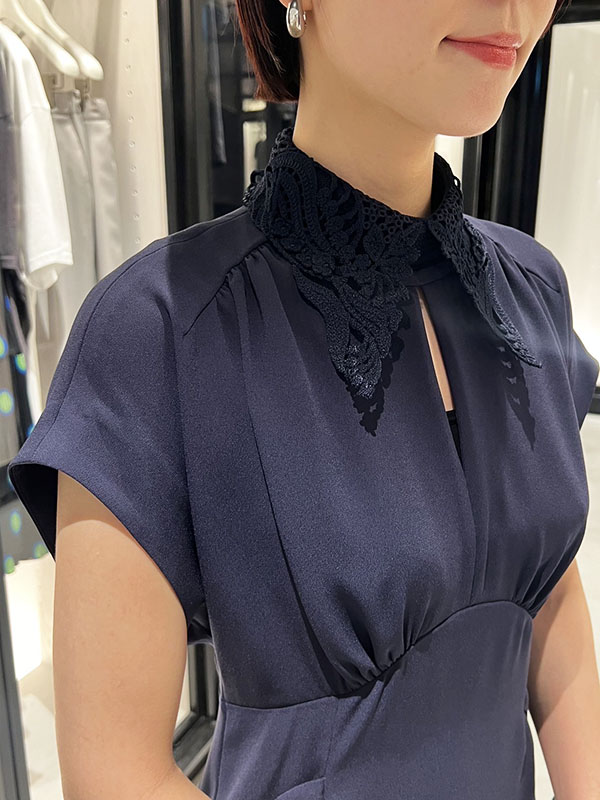 首元はシンプルなお作りでネックレスやイアリングなどのアクセサリーも一緒にお楽しみいただけます。