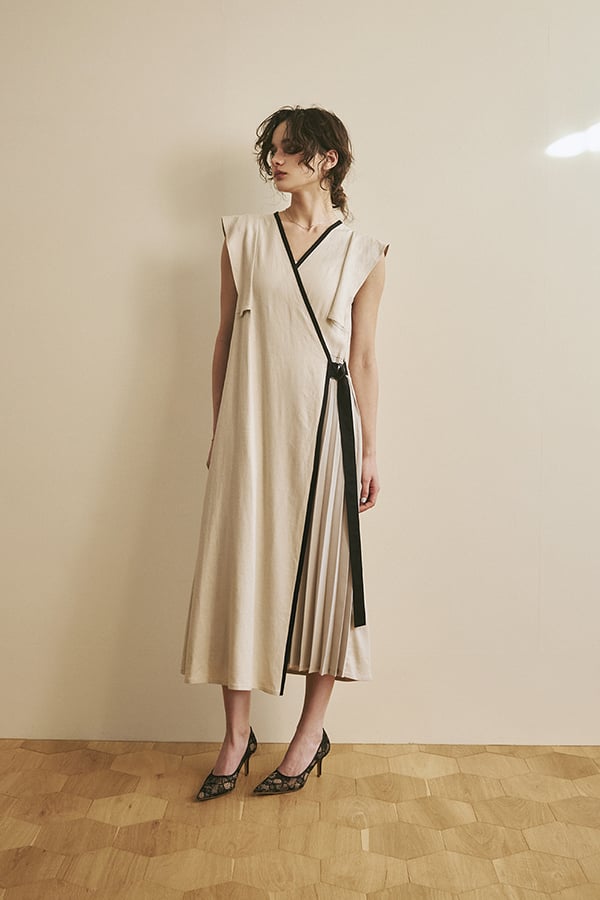 サイドに施されたアコーディオンプリーツが軽やかな動きを出してくれるカシュクールワンピースです。