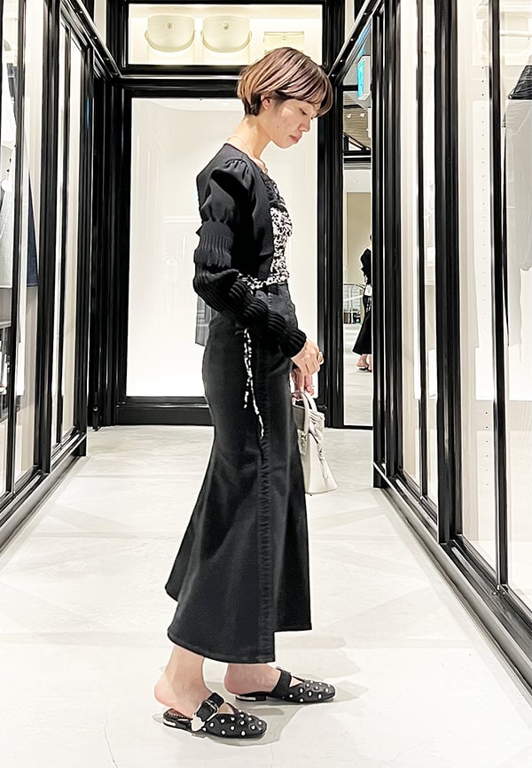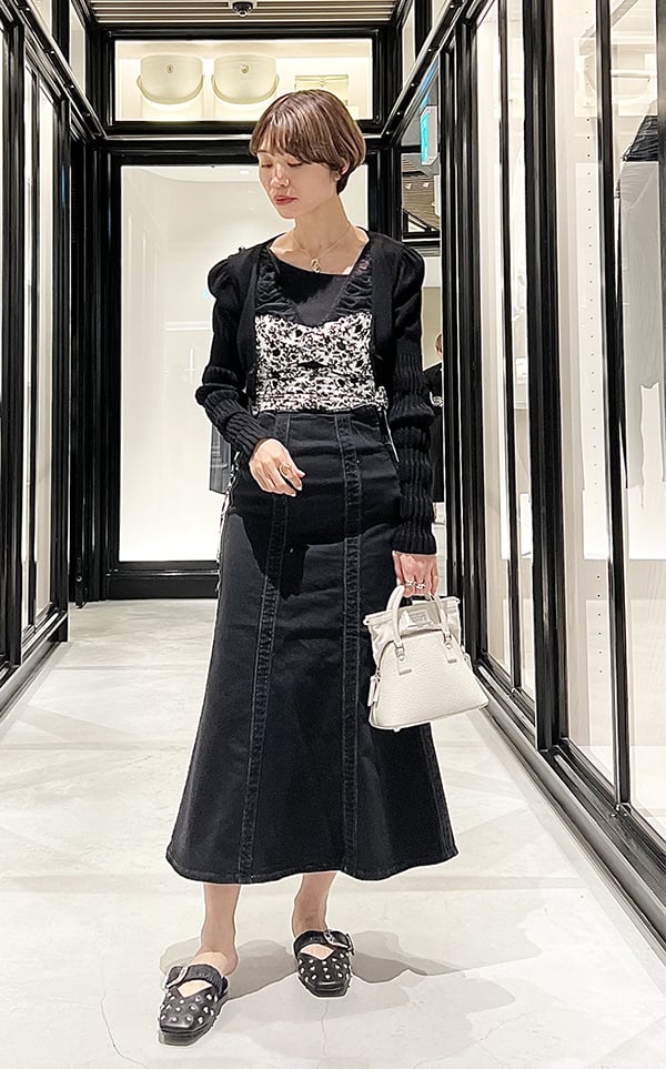 独特なデザイン性のあるフェティコのカーディガンと合わせて、とびきりモードなスタイリングに!