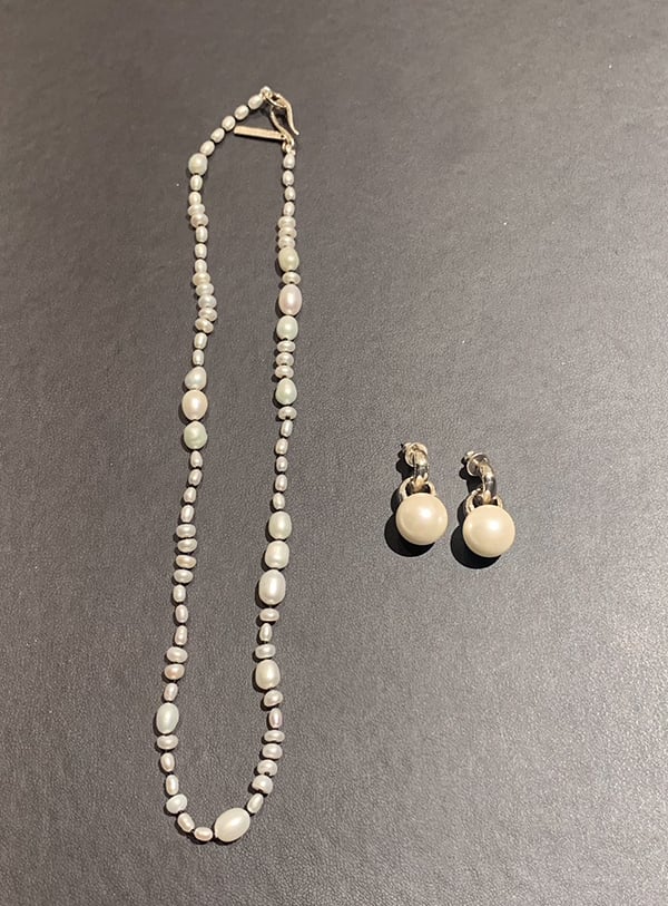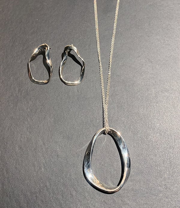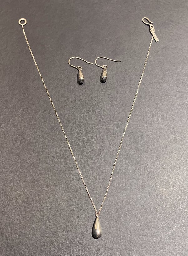 彫刻的なティアドロップをあしらい、繊細なチェーンが特徴のネックレスとピアス。