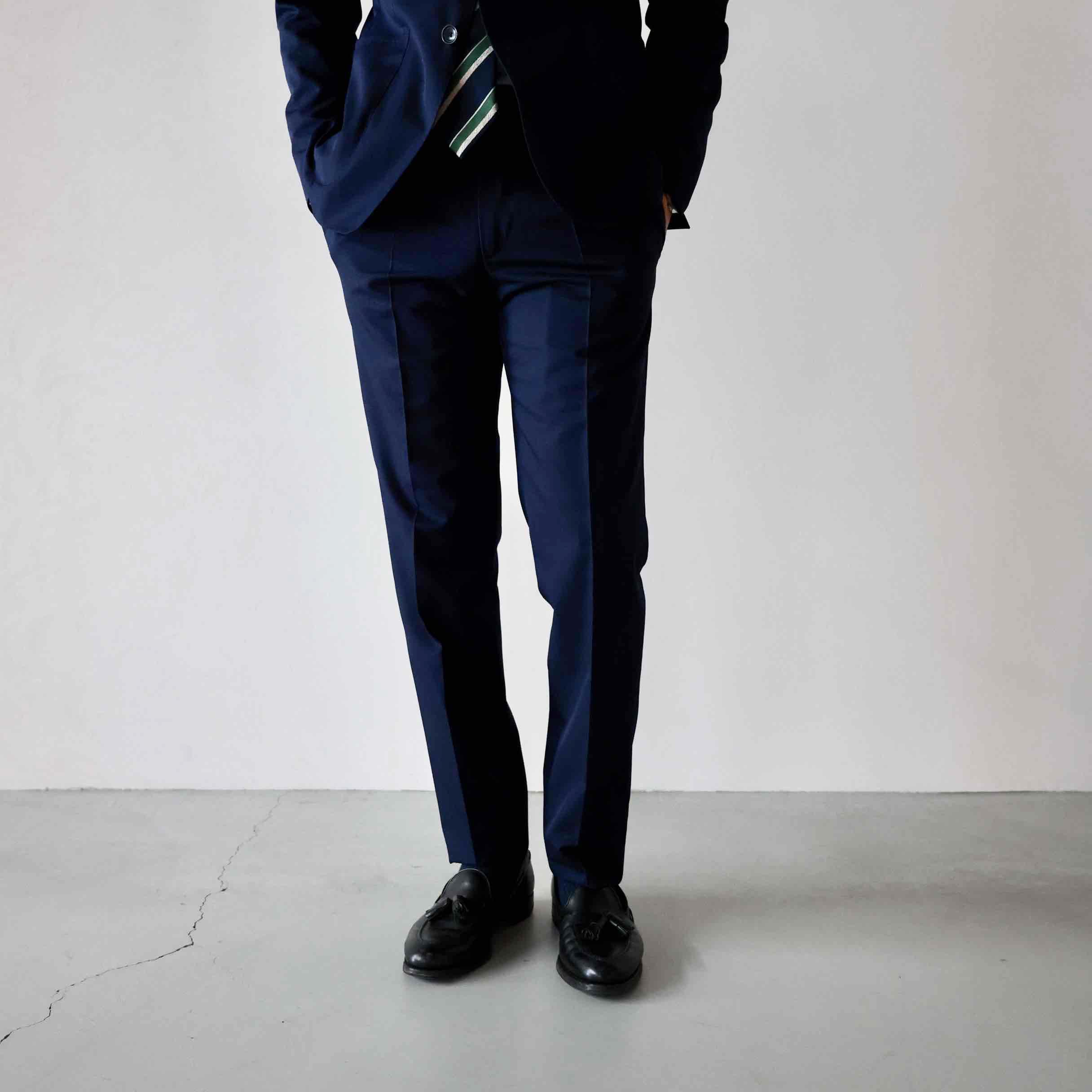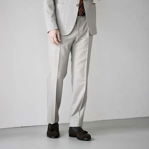 今回ジャケットはフラップポケット仕様ですがボトムスはドロストなしのトラウザーズスタイル。