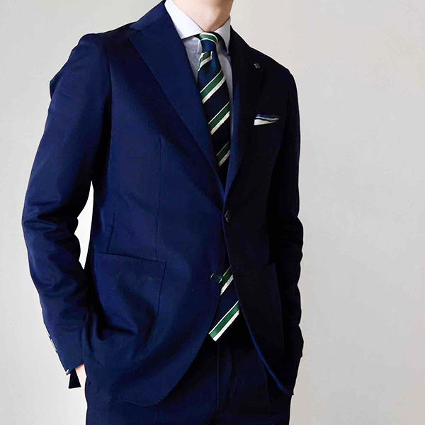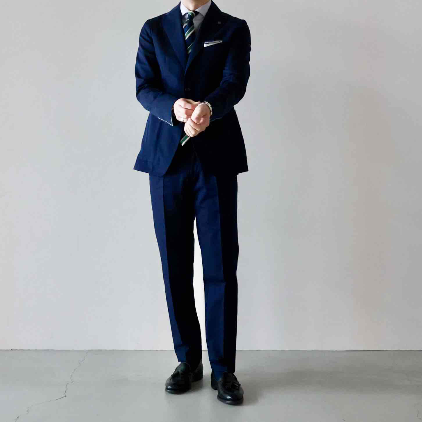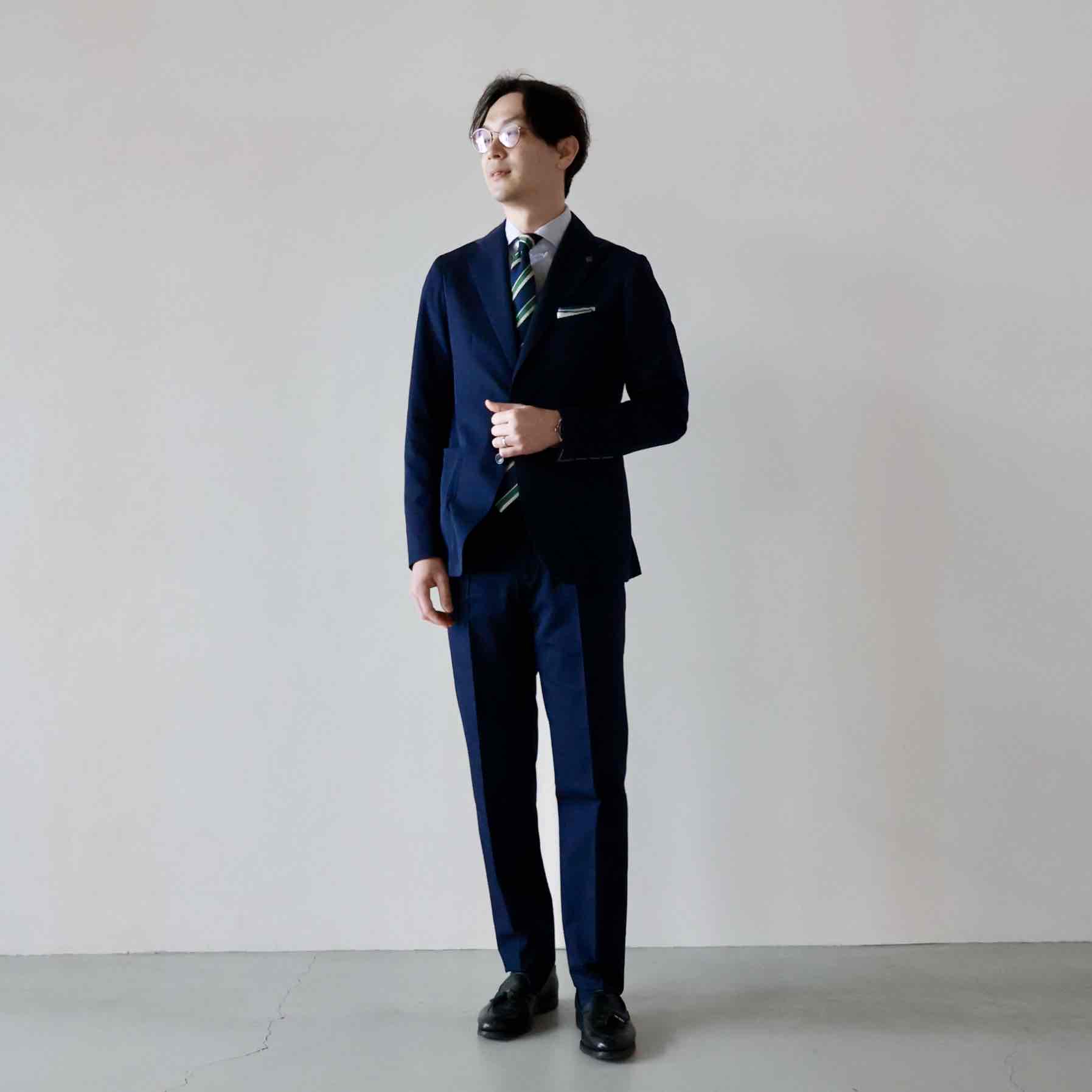 安定のネイビーはビジネスでも使用しやすいので、良いスーツを一着欲しいという方に着ていただき一着です。