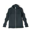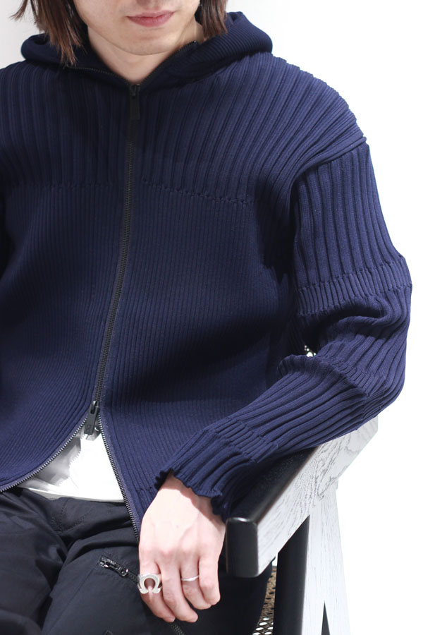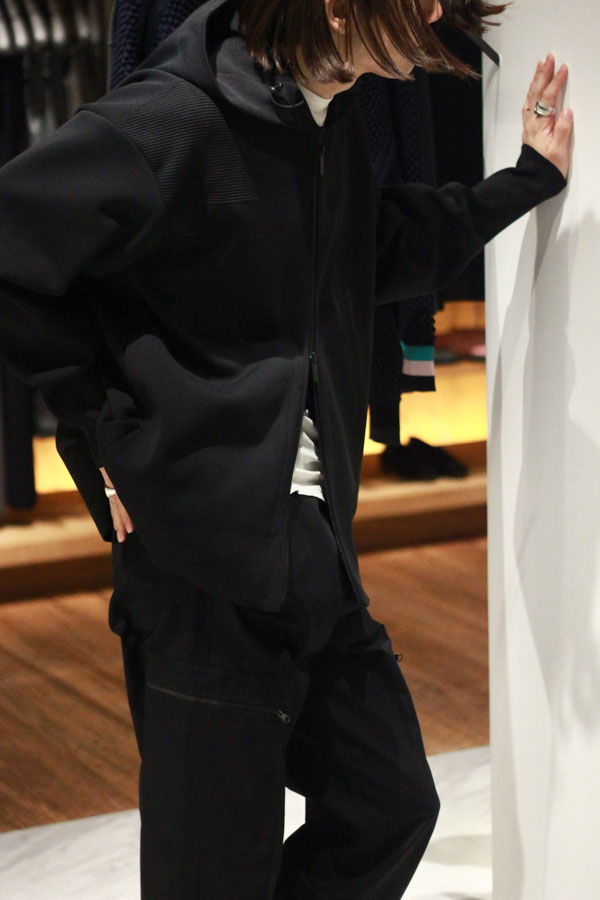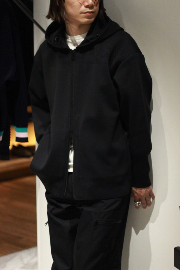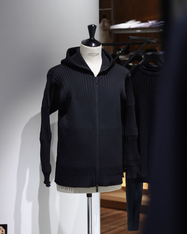 こちらのフーディジャケットはミラノリブで編まれています。ミラノリブは横に突っ張る力が働く織り方のため、素材が伸びにくく耐久性が高いです。ちなみにパンツ、ジャケットはミラノリブの編みが多いです。